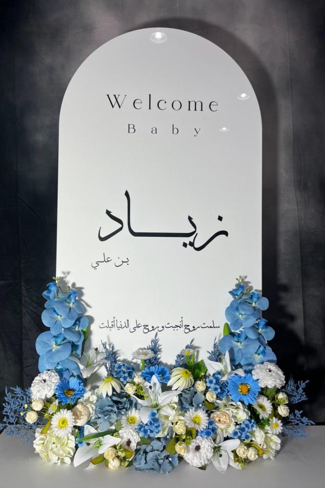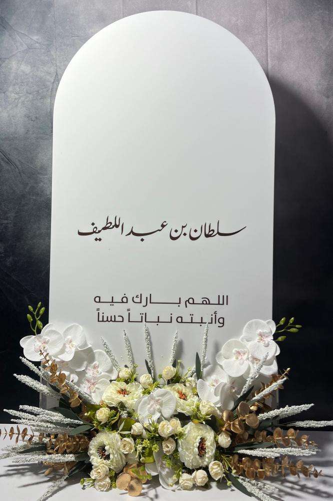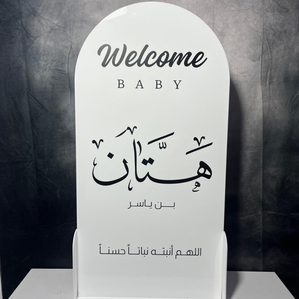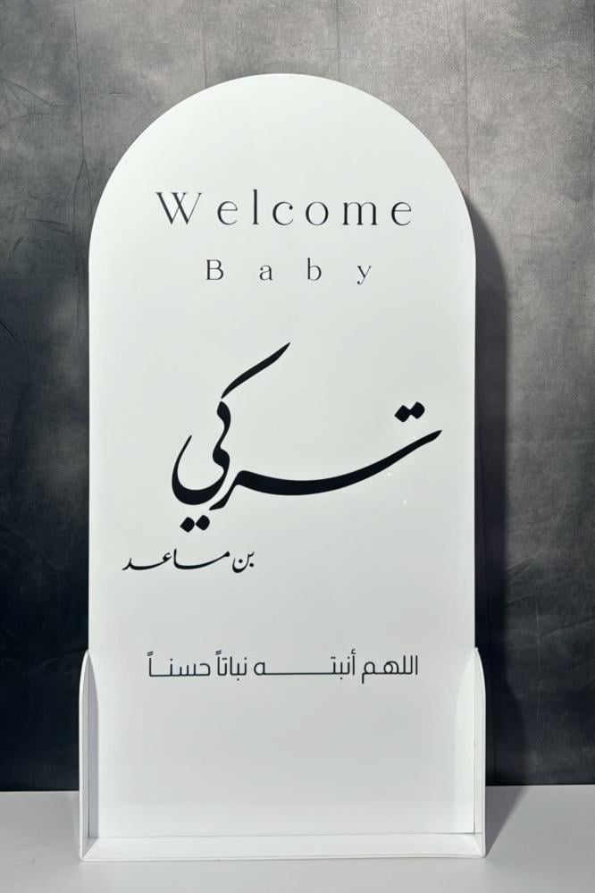 ستاند استقبال مصنوع من الأكريليك الأبيض الفاخر، مصمم خصيصًا لإضافة لمسة أنيقة للمناسبات، سواء لاستقبال مولود جديد أو الاحتفالات الخاصة. يتميز بتصميم عصري وقابل للتخصيص مع نقش دقيق للأسماء والعبارات حسب الطلب.